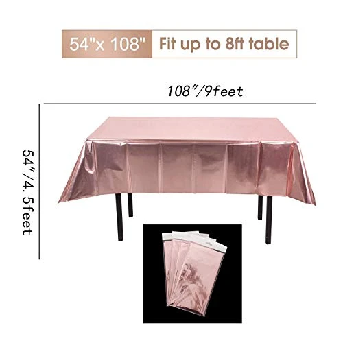 - Suitable for 8-feet table: the rose gold foil tablecloth is 54 x 108 inches / 4.5 x 9 feet; it can cover any table of 8 feet, and there are 6-inch overhang at least; you can cut it to the proper size according to your own thoughts and the table size
