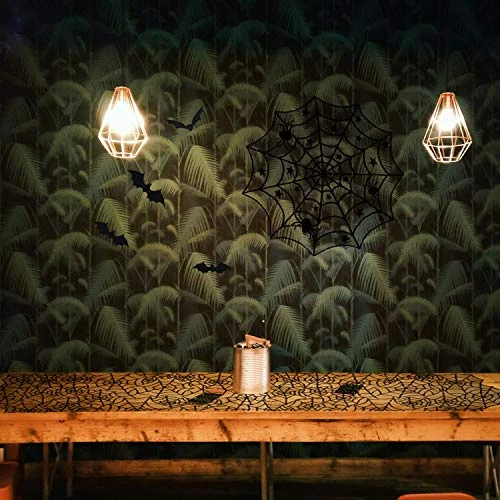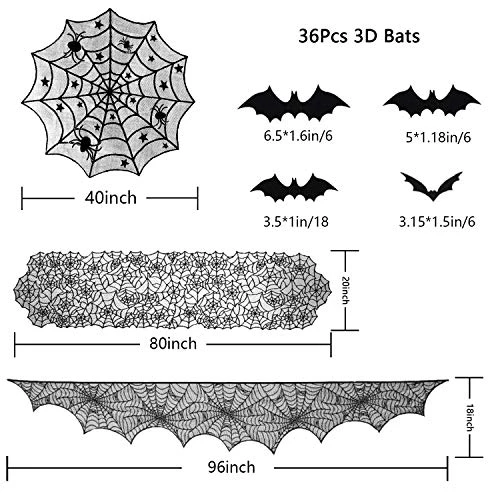 - 🎃Size: Spider web table runner measures approx.20 x 80 inches and the spider web round table cover is approx.40 inches in diameter and the spider wed fireplace scarf is approx.18 x 96 inches. 3D bat stickers in different sizes, respectively in approx.6.5 x 1.6 inches, approx.5 x 1.18 inches, approx.3.5 x1 inches, approx.3.15 x 1.5 inches