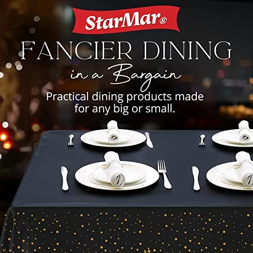 - MULTIPURPOSE TABLE COVER – Having a StarMar disposable tablecloth means having an instant banner, backdrop, and picnic mat in one! Our plastic party tablecloth isn’t just for dinner tables. It’s fancy design can be used as a door cover, wall background for pictorials, or as a banner during birthdays, weddings, or other events.