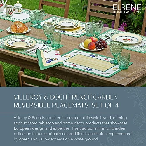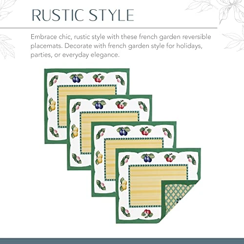 - CLASSIC STYLE: Enjoy making memories with these placemats. This set of 4 placemats has prints of beautiful and brightly colored fruit and green and yellow accents that bring simple elegance to any dining room.