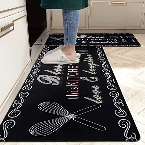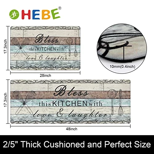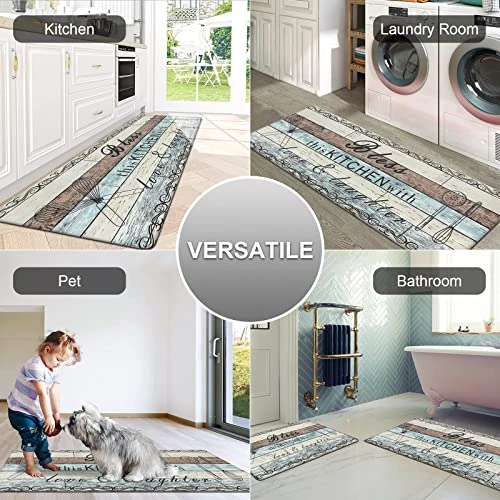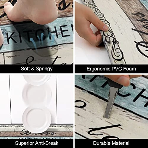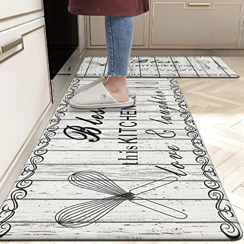 - No Tripping Distressed Kitchen Mat: The non skid kitchen runner rugs come with non slip backing and unique beveled edges,help prevent slipping or tripping, non slip latex rubber backing with honeycomb design can keep the mat stay in place. You can use kitchen mats on multiple surfaces(wood, ceramic, marble, etc), very comfortable foam construction.