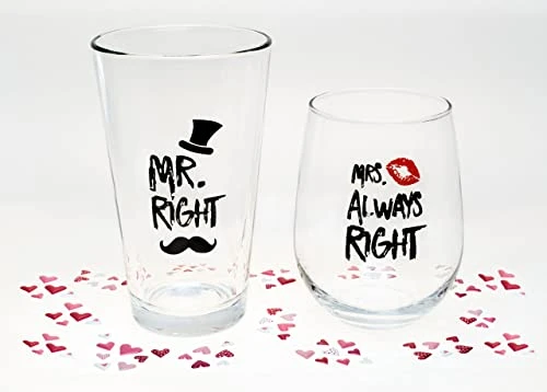 - ANNIVERSARY GIFTS – Mr and Mrs Wine Glasses with 16 oz pint glass for beer and 17 oz stemless wine glass for wine – or put whatever you’d like in them! They are a cute and fun couples gift either way that will be great for the newlyweds!