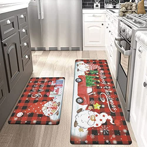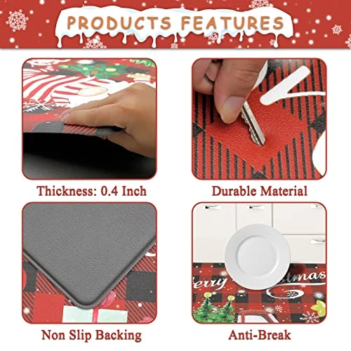 - Anti Slip Standing Desk Mat Set: Top of the anti fatigue kitchen mat is designed with attractive Christmas style and bottom is made of non-slip material; beveled edges help prevent tripping. The Christmas rugs kitchen mats may be used on multiple surfaces (tile, wood, ceramic, marble, etc). Heavy duty farmhouse kitchen rugs will not slide under its weight.