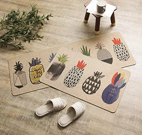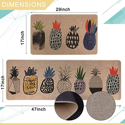 - ✅【Easy To Clean】Pineapple kitchen mats are quick and easy to clean, just spray off with a hose or use a sponge and mild detergent to clean off dirt or yard debris. our kitchen mats sets can help avoid oily water leaving ugly stains on your floor when cooking. The soft surface of washable kitchen floor mat can also keep falling sharp and fragile utensils from damaging your floor.