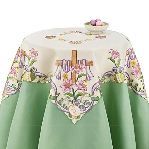 - These lovely table linens feature a detailed cross surrounded by beautifully embroidered lilies, Easter eggs and a twining purple ribbon around the openwork edges