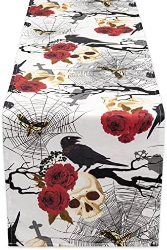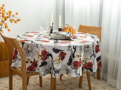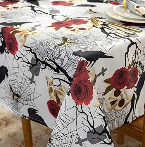 - ADD A CREEPY FINISHING TOUCH: This printed tablecloth is the perfect addition to decorate your tabletop for Halloween parties; Create spooky halloween scenes with decorative raven, skull, moths and red roses!