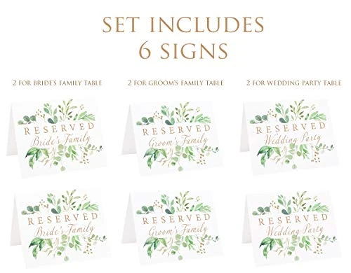 Reserved Wedding Table Sign | Set Of 6 Watercolor White And Gold With Eucalyptus Greenery Signs Including Seating For Bride’s Family Groom’s Family And Wedding Party | Freestanding Double Sided