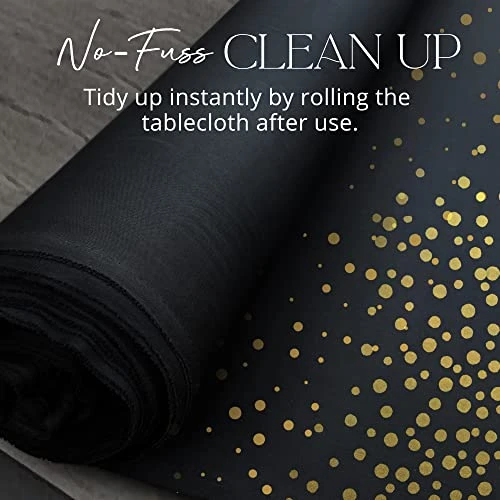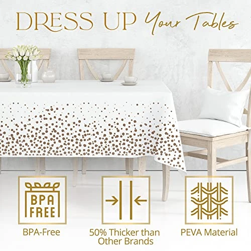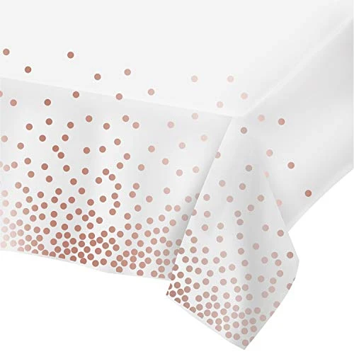 - CLASSY CONFETTI DESIGN – Our plastic rectangle tablecloth comes in white and black color tablecloth decorated with Silver, Gold, and Rose Gold confetti dots. Charm your guests with these simple yet elegant table covers. Pair them with napkins and cutlery sets that exude the same vibe for a complete fancy dining experience.