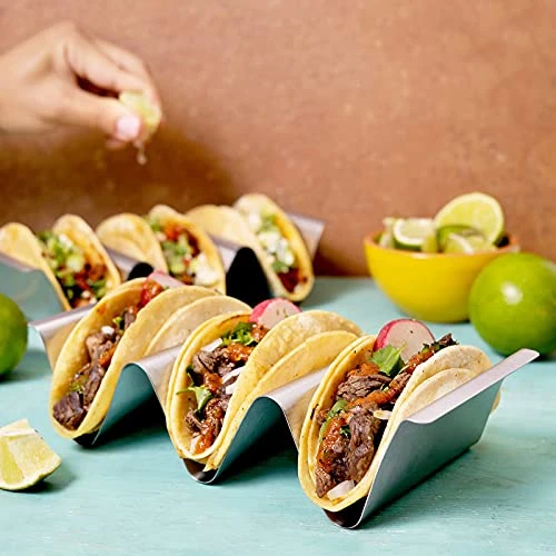 - GRILL & OVEN SAFE TACO RACK – Made out of stainless steel, these taco trays can be used right inside your oven to bake (or even reheat) your tacos! This made filling, baking and serving tacos all in 1 place!
