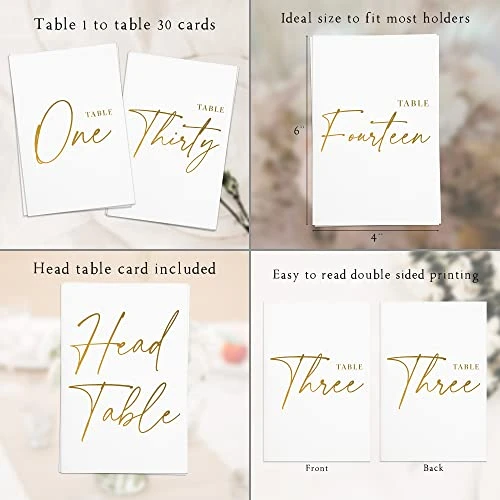 - COMPLETE SET: Includes table number cards from 1 to 30 plus a Head Table card. Each card is sized at 4×6 inches with double sided printing making them very easy to read.
