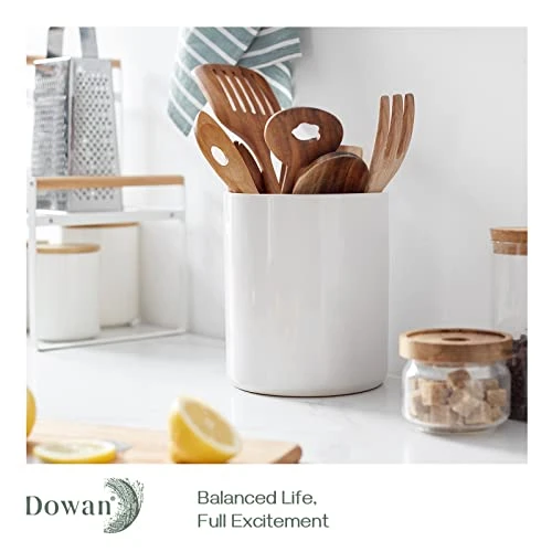 - Less is More. This kitchen utensil holder is minimalist in aesthetic but powerful in function. The pure white design is a perfect addition to any home kitchen and complements any modern and farmhouse kitchen decor! Plus, this white utensil crock is perfect for DIY.